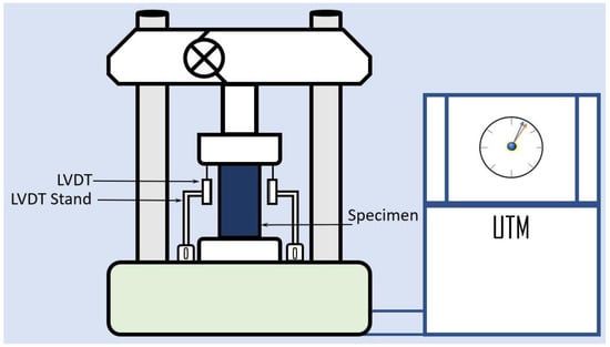 A monotonic compressive load was applied to each specimen by using a hydraulic Universal Testing Machine. The ultimate capacity of universal testing machine was 200 tons. A calibrated load cell was deployed to measure the intensity of the applied compressive load, whereas a logger recorded the measured load. A uniform application of the load was achieved by placing steel plates above and below the specimen, as shown in Figure 4. The axial shortening of the specimens under the applied compressive load was simultaneously measured by using two linear variable differential transducers (LVDTs). The recorded deflection was subsequently converted to the strain, whereas the recorded load was converted to compressive stress by utilizing the geometrical dimensions of specimens.