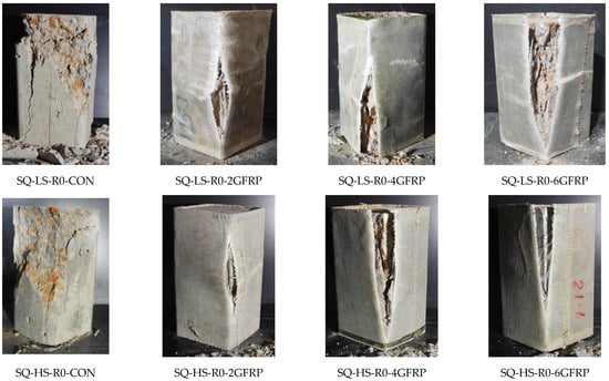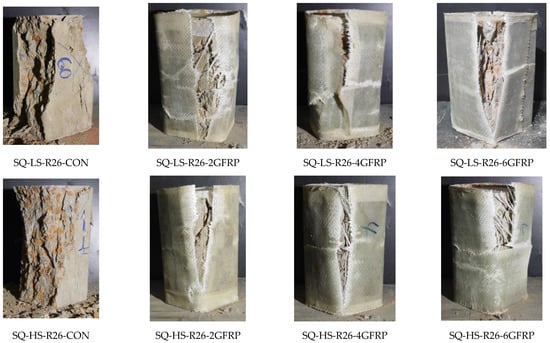The failure modes of the Group 2 specimens are shown in Figure 6. In the same way as the control specimens in Group 1, the failure of the Group 2 control specimens was brittle. However, the crushing and splitting propagated all along the full height. The low-strength-strengthened specimens in Group 2 failed due to the rupture of the GFRP sheets in the hoop direction. For the two and four GFRP layers, the tensile rupture of GFRP sheets was found to occur between the corners suggesting that the stress concentrations were mitigated successfully. Specimen SQ-LS-R26-6GFRP failed by the rupture of GFRP sheets at the corners. This can be attributed to the resulting high compressive strength of Specimen SQ-LS-R26-6GFRP due to six GFRP layers that may have eventually resulted in higher stress concentrations near the corners as compared to those in Specimens SQ-LS-R26-2GFRP and SQ-LS-R26-4GFRP. The failure of high-strength concrete specimens in Group 2 also exhibited rupture of GFRP sheets mainly near the corners, and a similar analogy of high-stress concentrations near the corners can be made due to the high concrete strength.