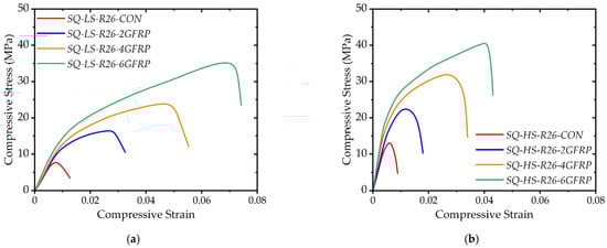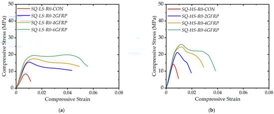 The recorded stress–strain behavior of Group 1 specimens is shown in Figure 7. Figure 7a shows the stress–strain curves for the low concrete strength specimens in Group 1. It is evident that a substantial improvement in the peak compressive stress was observed. The important parameter to be observed is the range of strain for which the peak sustained stress was maintained. This suggests that LC-GFRP imparted a considerable ductility to the concrete, which is crucial for strengthening against dynamic loads. The post-peak behavior of Specimens SQ-LS-R0-2GFRP and SQ-LS-R0-4GFRP was descending, whereas a stable second branch was observed for Specimen SQ-LS-R0-6GFRP. On the contrary, the second branch of the compressive stress–strain curves of the high-strength specimens in Group 1 was descending irrespective of the number of LC-GFRP layers. The second difference in Figure 7a,b is the value of the ultimate strain. The high-strength specimens were able to sustain compressive stress to lower strain values as compared to low-strength specimens.