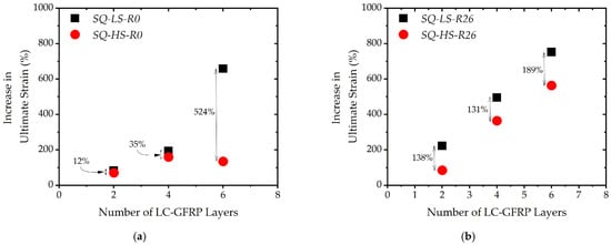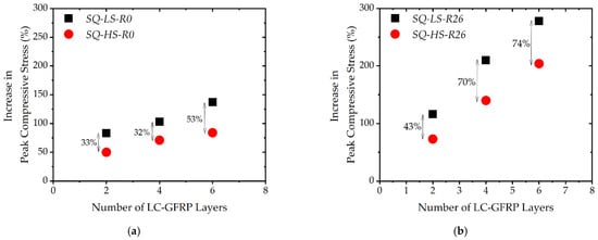 The effect of the concrete strength on the gain in peak compressive stress due to LC-GFRP confinement is shown in Figure 9. It is evident that the gain in peak compressive stress is dependent on the concrete strength. For both of the groups and for the same number of LC-GFRP layers, the specimens with low concrete strength demonstrated greater improvement in the peak compressive stress than high strength specimens. Another observation that can be made from Figure 9 is the effect of corner radius on the improvement in peak compressive stress. For the case of no corner radius (see Figure 9a), the maximum increase in the peak compressive stress observed for Specimen SQ-LS-R0-6GFRP was 137%, whereas the corresponding value for a 26 mm corner radius was 278%, observed for Specimen SQ-LS-R26-6GFRP.