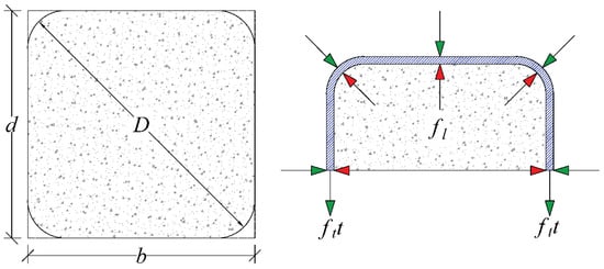 Equilibrium between core pressure and the resulting confining forces (b = width, d = depth, D = diagonal diameter, fl = lateral confining pressure, t = thickness of FRP).