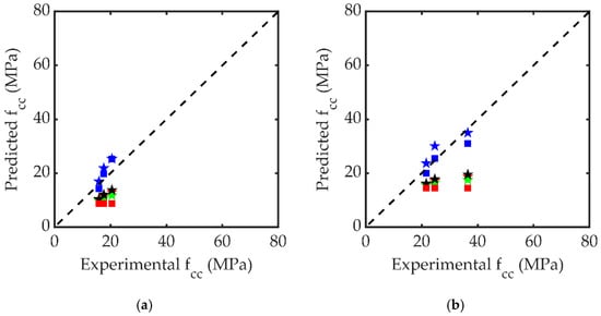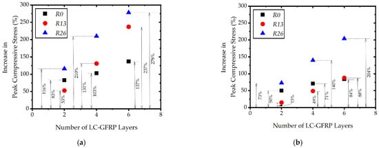 Regression analysis was performed to propose equations for the peak compressive stress, and the ultimate strain of LC-GFRPP-confined RBAC. Six specimens tested by Rodsin et al. [] were also included to increase the sample size. It should be mentioned that the samples tested by Rodsin et al. [] incorporated a corner radius of 13 mm as opposed to the 26 mm corner radius in the present study. Figure 14 presents the effect of the corner radius on the increase in the peak compressive stress of RBAC due to LC-GFRP confinement. In general, it is observed that the increase in the peak compressive stress for the same layers of LC-GFRP and concrete strength is improved as the corner radius is increased. Therefore, the effect of the corner radius must be included in the proposed equation of peak compressive stress. Secondly, it is observed that the increase in the peak compressive stress is more in Figure 14a (low-strength concrete) than in Figure 14b (high-strength concrete). Therefore, the effect of unconfined concrete must also be included. Finally, the effect of the lateral confining pressure due to LC-GFRP confinement is also evident in Figure 14 as the compressive stress increases with the increase in the layers of LC-GFRP.