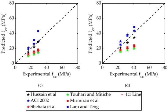 The accuracy of the models in Table 5 is shown in Figure 12 to predict the peak compressive stress of LC-GFRP-confined concrete. Unlike the findings of Rodsin et al. [], the model of Hussain et al. [] underestimated the peak compressive stress of LC-GFRP-confined specimens with zero corner radius (see Figure 12a,b), whereas the models of ACI 2002 [] and Lam and Teng [] seem to provide good agreement with experimental results. For specimens in Group 2, the model of Hussain et al. [] seems to correlate well with the experimental results along with the model of ACI 2002 []. From the study by Rodsin et al. [] and the present study, it can be seen that none of the considered models were able to provide good agreement with the experimental peak compressive stresses on a consistent basis.