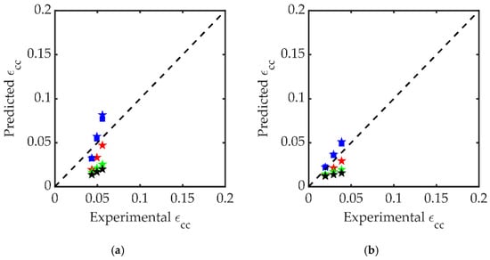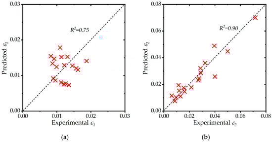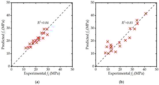 The accuracy of Equations (7) and (8) is shown in Figure 16a,b, respectively. A good correlation between the experimental and predicted values of and .