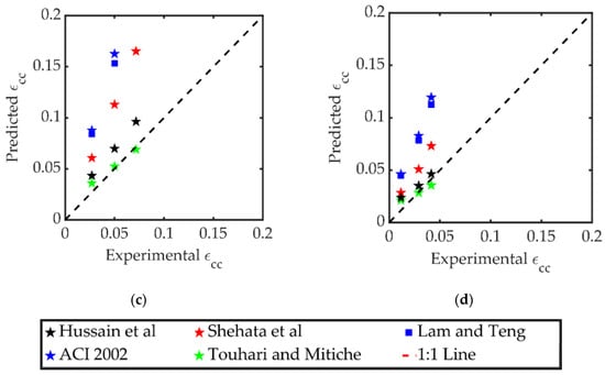 Comparison of predicted vs. experimental ultimate strains of subgroups (a) SQ-LS-R0, (b) SQ-HS-R0, (c) SQ-LS-R26, and (d) SQ-HS-R26 [,,,,].
