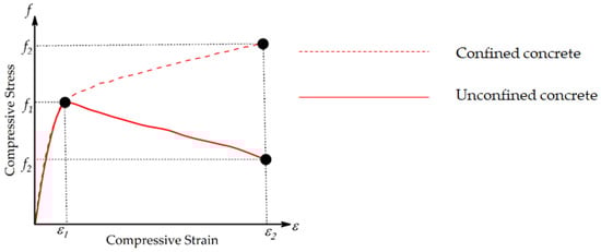 The regression analysis was performed to predict equations for four quantities, mainly peak compressive stress and corresponding strain , ultimate stress and the corresponding strain as shown in Figure 15. The nonlinear regression analysis was conducted using the classical Gauss–Newton method, and the analysis was performed using SPSS Statistics. It was discussed in Section 3 that both ascending and descending behavior was observed in the second branch of the stress–strain curves depending upon the concrete strength and corner radius. Equations (7) and (8) were found to correlate well with the experimental results of and by considering unconfined concrete strength , the confining pressure , and corner radius :