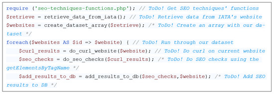 The software tool created for the purpose of this article draws the dataset from IATA’s website and stores each result in a MySQL database. It then runs through the dataset and extracts the source code from each airline’s website via cURL. CURL is a computer software project providing a library (libcurl) and a command-line tool (curl) for transferring data using various network protocols [51]. For each of the 15 SEO techniques presented in Section 2, a separate function was created, which searches the source code of the targeted website to find out if the SEO technique has been applied. Finally, the results from the checks are stored back in the database. A comprehensive example of the generated code and its main functions is shown in Figure 2.