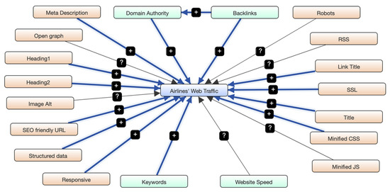 After conducting SEO evaluations on 243 airline websites, the exported results imported to IBM SPSS 27 (IBM, Armonk, NY, USA). Organizations use IBM SPSS Statistics to understand data, analyze trends, forecast and plan to validate assumptions, and drive accurate conclusions [55]. Descriptive analysis in different correlations was conducted, confirming the research hypotheses that follow. Finally, a fuzzy cognitive map (FCM) was created to graphically represent the relationship between SEO techniques, traffic, and backlinks, showing the direct correlation of SEO techniques with traffic and, consequently, the bookings and sustainability of airlines.