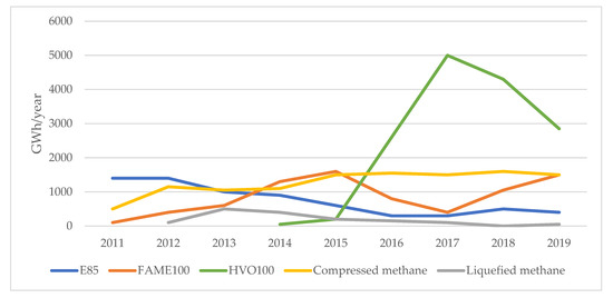 The use of high blends of renewable fuels in the transport sector in Sweden, based on data from the Swedish Energy Agency [43].