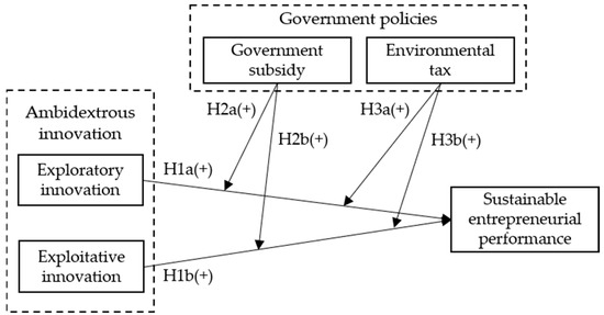 Due to the high-risk and high-cost nature of innovation and the importance of sustainable entrepreneurial behavior, government policy needs to take steps to provide reasonable support and necessary regulation. On the one hand, government subsidies are one of the ways to support enterprise innovation and alleviate financing difficulties, and it has an important incentive effect for enterprises to achieve transformation and upgrading [11]. On the other hand, the environmental tax makes full use of the price factor to impose differentiated taxation on enterprises with different pollution levels, forcing enterprises to reduce pollution and helping enterprises achieve double dividends of greenness and innovation [12]. It can be seen that government subsidy and environmental tax are effective means to deal with the challenges of sustainable entrepreneurship for enterprises. However, although government support policies and regulatory policies are critical to the sustainable entrepreneurial performance of ambidextrous innovation practices, little existing research has focused on the combined effects of government subsidies and environmental taxes, and how they work. These questions need to establish a systematic research framework to explore.