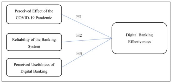 According to past studies, the COVID-19 pandemic had already changed public lifestyle and financial administration. The impact of COVID-19 forced authorities and the public to familiarise themselves with digital banking to mitigate infection risk. Indonesian researchers studied the acceptance of digital banking before and after COVID-19 struck Indonesia. In their study, ref. [30] found a drastic increase in digital banking reliance after the COVID-19 pandemic. A study in Malaysia by [31] on digital payments before and after COVID-19 found an upward trend in the usage of non-cash payments through digital means after COVID-19 as the pandemic caused statutory social distancing and control orders in the country. Similarly, in a study of branchless banks in Iran, ref. [32] found that marketing the use of digital facilities to customers became easier due to the COVID-19 pandemic. The third hypothesis to test the relationship between the perceived effect of the COVID-19 pandemic and the effectiveness of digital banking for ABC Bank’s clients is as follows: