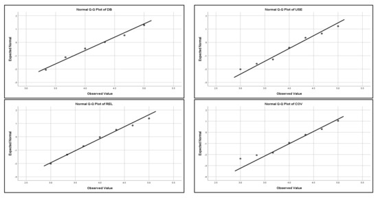 In addition to the above tests, the Q–Q plots may be used to show whether a distribution is normal. The plots provide a broader view of the distribution. The dots generally follow the trend line if the distribution is normal. Although Q–Q plots may indicate that the data are not far from normal, the p-value would be low if the large sample size. For minor deviations from normal, a test with large sample size is likely to indicate considerable deviations from the normal distribution [43]. The data for this study clustered around the trend line, as shown in Figure 2. Hence, the distribution is normal.