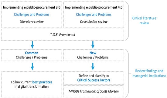 This study attempts to lead by examining common and distinct challenges and problems in the transition from era 3.0 to era 4.0 of e-PP. To achieve this, it collects and categorizes problems and challenges of the 3.0 era, groups them with the method T.O.E., and attempts to classify them with the MIT90s model to have an understandable cognitive structure for those who make decisions. Previous studies underline that a digital transition plan from one era to another requires a deep understanding and accurate T.O.E. classification [] of the challenges and barriers that interpret adoption readiness and effectiveness []. The next step is transforming these challenges and barriers to critical success factors (CSFs) for practical managerial implications. Numerous significant studies and reports have been conducted on the critical success factors for implementing e-procurement [,,,,,]. Likewise, there are studies on the potential of the fourth industrial revolution technologies in procurement in the private and public sectors [,,,,,,,].