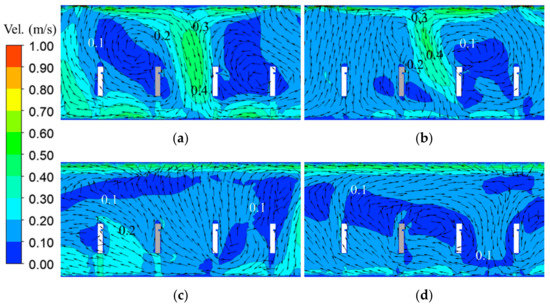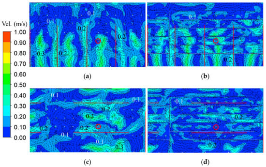 Zoomed-in velocity distributions in the horizontal section at the height of mouths (1.56 m) in: (a) Case 1-1, (b) Case 1-2, (c) Case 2-1, and (d) Case 2-2. (Source is marked by red circle. Red lines denote the slot linear air diffusers).