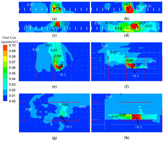 Zoomed-in 2D quanta distributions in the vertical section across the center of the source’s mouth in: (a) Case 1-1, (b) Case 1-2, (c) Case 2-1, and (d) Case 2-2; and in the horizontal section across at the height of mouth (1.56 m) in: (e) Case 1-1, (f) Case 1-2, (g) Case 2-1, and (h) Case 2-2. (Source human body is marked in gray in (a–d) and marked by black circle in (e–h). Red lines in (e–h) denote the slot linear air diffusers).