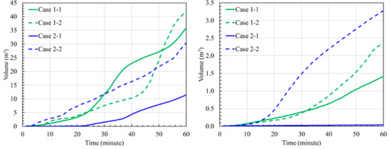 Figure 6 shows an increase of the region with the infection risks to be higher than 1% and 5% (called 1% risk region and 5% risk region henceforth) in the breathing zone along with time in each case. Here, the space occupied by the human bodies and plastic barriers was not counted. In Case 1, the 1% risk region was similar in size with the exposure less than 25 min whether plastic barriers were present or not. The increase of 1% risk region started to accelerate after a 25-min exposure in Case 1-1 and after a 45-min exposure in Case 1-2. For the 5% risk region, using plastic barriers did not make a notable change in its size with an exposure less than 34 min; however, later, the region was continuously larger than the condition not using plastic barriers and the difference was gradually increased. In Case 2, the presence of barriers always increased the risk regions, with the difference increased with time when compared to the no barrier case. The impact of barriers was even more striking for the 5% risk region. It is worth pointing out that the size of each risk region was always smallest in Case 2-1, independent of risk and exposure time because of the greater distribution of small viral aerosol concentration at the height of the breathing zone. In contrast, with plastic barriers aligned parallel to the ceiling diffusers (Case 2-2), the volume of the 1% risk region was larger than other cases up to 30 min. There was little difference among the cases for the 5% risk volume for the first 15 min. After 15 min, the effect of the Case 2-2 configuration produced an increasing volume of high risk.