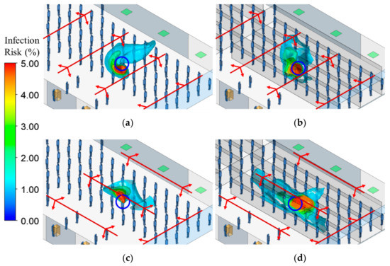 Figure 7 demonstrates the risk distributions by iso-surfaces with the infection risk to be 1%, 2%, 3%, 4%, and 5%, in each case. Installing plexiglass barriers reduced infection risk distribution at the direction perpendicular to the passenger lines in Case 1-2; however, remarkably increased infection risk in the canyon with the source in Case 2-2.