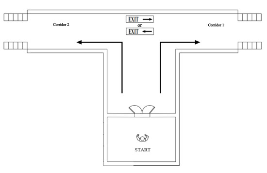 Signs play a very important role in evacuation, and the interaction between individuals and signs is complex. Therefore, there are a lot of studies on the effectiveness of evacuation signs and their impact on pedestrian behavior. For this reason, various simulations [16,17,18,19] and experiments [20] have been carried out. Kim et al. [2] conducted some experiments considering viewing distance and angle using a backlit signage system, introduced the concept of effective cognition area (ECA), and analyzed cognitive changes under smog conditions. Bae et al. [21] analyzed the decision time and follow-up rate required for participants to observe visual stimuli of signs preceding a T-junction. It was found that participants showed shorter decision time to the right arrow direction of the sign, and decision time increased when the sign was mounted in a lower vertical position.