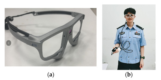 Experiment 2 adopts mixed-reality technology to build an experimental environment. Mixed reality is the result of the combination of the real world and a virtual world. The technology first scans, analyzes, and recognizes the real world, and stores the results as electronic information. Starting from the real world, virtual objects and characters are arranged in it, and virtual structures can also be used to describe the structure of the real world. On 22 January 2015, Microsoft released the first-generation mixed-reality device Microsoft HoloLens, which realizes the hybridization of the virtual world and the real world, placing users in a mixed-reality world. This experiment is mainly carried out by integrating an eye tracker (wearing MR-ET equipment) in MR. The first company to develop eye tracking adapted to HoloLens was Pupil, which specifically designed binocular pupil cameras and corresponding mounting brackets for HoloLens. Pupil eye tracker (HoloLens version) is used in this experiment, as shown in Figure 3:
