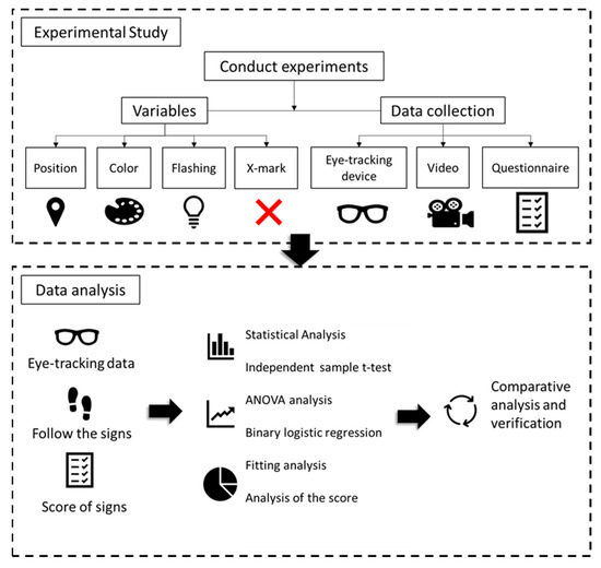 In this paper, eye movement data such as gaze position, fixation duration, the number of gazes and gaze point numbers of the participants were collected, as well as the score data of the participants on different signs. Statistical analysis methods such as fitting analysis, independent sample t test, binary logistic regression, and variance analysis were used. The research flow chart is shown in Figure 6.