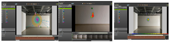 When the virtual reality world is successfully scanned, the next step was to click on the virtual evacuation sign to begin sign arrangement. The evacuation sign will automatically find a suitable location on the wall. As can be observed from the Figure 5, when the wall is flat, there is a green shadow on the back of the evacuation sign, indicating that the wall is suitable for sign placement. When the wall is not flat or the area is insufficient for evacuation sign placement, there will be a red shadow on the back of the evacuation sign, indicating that the area is unsuitable for sign placement. Next, click the evacuation sign again. The sign can be placed on the wall if the background is green.