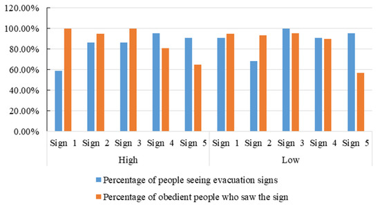 It can be deduced from Table 8 and Figure 8 that the number of participants who saw Sign 3 was the largest and the obedience rate was also the highest, which shows that participants processed the sign more efficiently. There was no significant difference between the number of people who saw Sign 5 and the number of people who saw other types of signs, while the number of participants who followed Sign 5 was significantly lower than the number of people who followed other types of signs; the number of people who saw high Sign 1 and low Sign 2 is significantly lower than the number of people who saw other types of signs, but the proportion of people who obey is higher, with an average of 97.5% and 94.04% respectively.