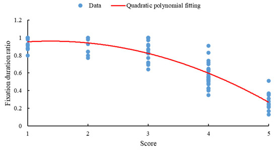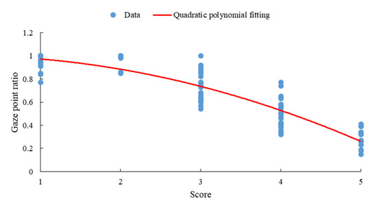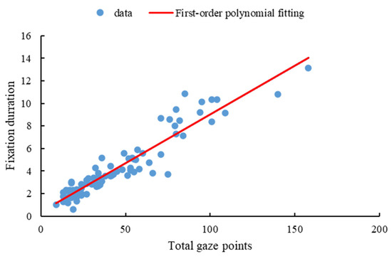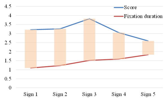 The scoring is the data obtained by using the traditional questionnaire survey experiment method, the gaze point is the data obtained by the eye tracking experiment device, and the gaze point data include fixation duration and total gaze points. The correlation coefficient between fixation duration and score is −0.84, the correlation coefficient between total gaze points and score is −0.89, and the score and gaze point show a negative correlation. The more participants recognize a type of sign, the higher the score they will give, and the easier a sign is to understand by the participants, the shorter the time taken to look at it and the less time is taken for brain decision making, gaze point numbers and fixation duration.
