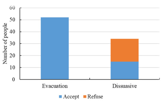 More than half of the participants did not accept the evacuation direction information provided by the dissuasive sign. This is because people have not used the dissuasive sign in their daily lives and may have mistakenly regarded it as an evacuation sign. Due to this misunderstanding, the individuals tend to choose the same direction indicated by the dissuasive sign, contradicting the original intent of the dissuasive sign.