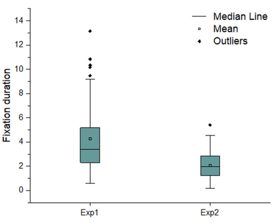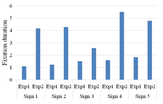 It can be seen from Figure 15 and Figure 16 that the distribution of the fixation duration of the participants in Exp1 and Exp2, the differences in fixation duration are also different for different signs. The fixation duration difference for Sign 3 is the smallest, while for Sign 4 it is the largest.