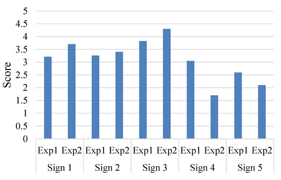 From Figure 9 and Table 10, it can be concluded that the participants gave the lowest score to Sign 5 in the low place and the highest score to Sign 3 in the high place; regarding comprehensive location, the participants gave the lowest score to Sign 5 and the highest score to Sign 3. Therefore, the score data of the participants also confirmed our conjecture from the side.