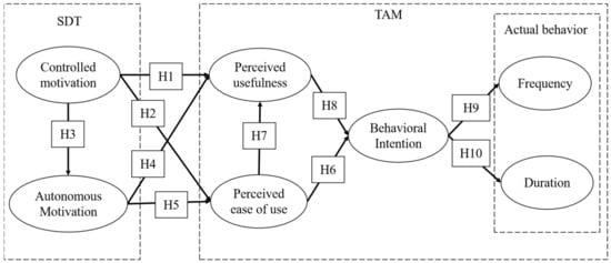 Based on the above hypotheses, we developed an empirical conceptual model describing the relationships between constructs of SDT and TAM as shown in Figure 1.