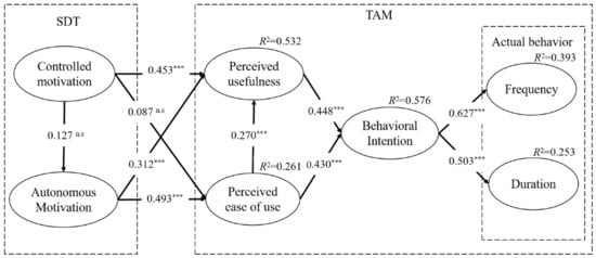 Besides examining the hypotheses, we calculated the values of R2 in order to evaluate the explanatory power of the research model (see Figure 4). All the R2 are beyond 0.10, suggesting that the independent explanatory variables are acceptable [47,69]. The R2 values of PU, PEOU, BI, behavior frequency, and behavior duration showed that these variables were explained by their antecedents in 53.2%, 26.1%, 57.6%, 39.3%, and 25.3%, respectively. Figure 4 shows the structural model examination results findings about the hypothesized relationships examination.