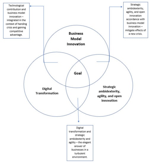 Although the category that SMEs belong to, the implementation and adoption of digital technologies as well as the utilization of digital skills, are no longer an optional activity for businesses but a key factor for survival and building new business models []. A few researchers in the field of digital transformation and business modeling have proposed new business models for SMEs that integrate the dimension of digital transformation and help them to adopt into the new circumstances that the pandemic of COVID-19 has caused []. Their business model is based on the theory of business model innovation, but they updated it with the integration of digital transformation and the triple win formula of strategic ambidexterity, agility and open innovation (Figure 1). In addition, this model help SMEs to secure their business continuity in a volatile and ever-changing environment. Additionally, it enables SMEs to generate value in this new business environment.