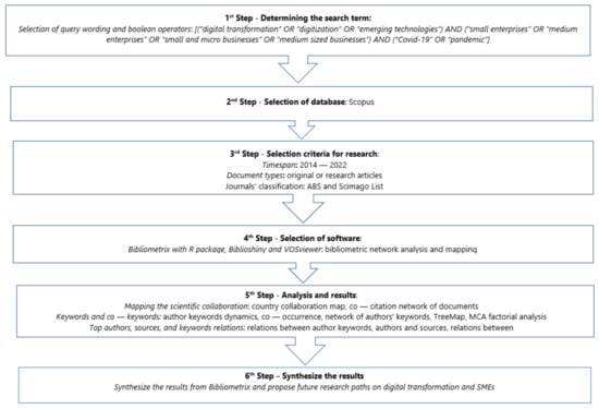 Therefore, the questions that arise regarding the effects that new technological developments are expected to bring to the immediate horizon of small businesses are reasonable and varied. In this context, this research attempts to highlight the most basic aspects and extensions of the digital transformation of the global economy, with a particular emphasis and focus on micro and small businesses []. In addition, the components of this research focus both on the broader dimensions of research trends in digital transformation, such as the integration of the new “digital world” and the powerful challenges emerging for small businesses. To approach the research, questions on the scientific method of Bibliometrix were applied. The scope of the bibliometric analysis based on R package illustrates the state of the art of the field of digitalization and SEMs during the pandemic of COVID-19 and presents the research trends, as well as other related indicators by analyzing manuscripts published in Scopus [,]. Moreover, the software of Biblioshiny and VOSviewer contribute to the identification of the research gaps and opportunities for SMEs through the integration of digital transformation into their business models.