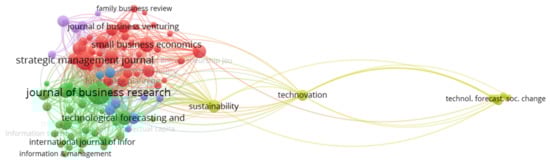 Moreover, co-citation analysis of the relevant sources in the research field (Figure 3) provides a more forward-looking assessment of the sources. Figure 4 organizes the sources in five clusters, while findings of the figure confirm that of Table 1. Thus, the Journal of Business Research is highlighted as the journal with the most related research works in the field of digital transformation of SMEs during the pandemic of COVID-19.