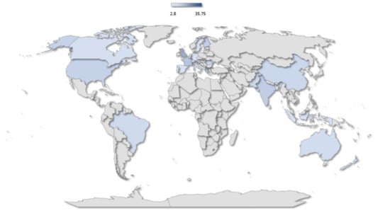Table 2 illustrates the countries with the highest production of scientific papers in the field of digital transformation of SMEs in the pandemic of COVID-19 for the timespan 2014–2022, while the same data were visualized with the use of GIS software (Figure 5).