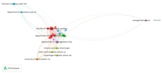 Moreover, the map of the co-citation analysis of institutions reveals the dynamics of these institutions in the research field (Figure 7). In the figure, there are eight clusters and 30 items.