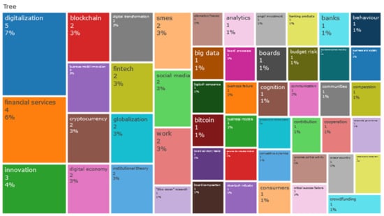 The authors’ keyword analysis is a bibliometric tool that helps both researchers and search engines to identify the most relevant papers of the research field that they are interested in [,]. In addition, the authors’ keyword analysis can contribute to the increase of the number of readers of the paper, which means that the manuscript can be more cited by scholars. In addition, analysis of authors’ keywords can lead to the identification of the research trends, as well as the gaps in the studied field. Figure 8 and Figure 9 presents the Word TreeMap, which indicate the top 50 most used keywords in the manuscripts on the research field of digital transformation of SMEs for the timespan 2014–2018 and 2019–2022 respectively. The TreeMap in Figure 8 indicates the concepts of digitalization, financial services and innovation, as the top three of the most cited keywords, in the research field of businesses’ digital transformation for the time period 2014–2018. Results during this period show that businesses started integrating digitalization and innovative services in their business model. Among the sectors that followed this path, finance was the first that directly integrated into the new digital world. Particularly, the sector introduced financial services exclusively through emerging technologies. This form of services is well known as Fintech and came to revolutionize the finance sector [,].