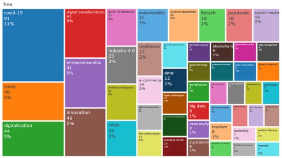 TreeMap in Figure 9 highlighted the situation created by the pandemic of COVID-19, which had significant effects on the daily operation of SMEs, resulting in their decision to integrate new technologies and follow the path of digital transformation. Thus, the very concept of digital transformation has “ripened” in SMEs consciousness and findings come to a critical conclusion: without the digital technologies that have enabled the possibility of telecommuting and remote transactions during the COVID-19 pandemic, the effects on the competitiveness, employment and business continuity of SMEs would be multiple [,,,]. So, the pandemic of COVID-19 set a modern digital culture, which places digital transformation in the core of SMEs, as a strategic choice and not as a “flag of opportunity” [].