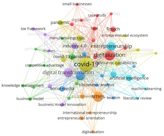 Furthermore, the crucial role of COVID-19 and its impact in the transformation of SMEs to the digital environment is also highlighted by Figure 10. This figure presents the network visualization based on the co-occurrence of the authors’ keywords [,]. To visualize these data, the bibliometric software of VOSviewer was applied. VOSviewer is software that helps researchers to build a bibliometric network, as well as to visualize the information of this network. Each of the circle presents the occurrence and the bigger the size of the circle, the stronger is the co-occurrence of authors’ keywords. The similar color of the circles indicates the cluster of the keywords, and the lines between the circles illustrates the link between the keywords. A total of 55 words were selected and divided into seven clusters, and each cluster has a different color. Cluster in red and purple color represent the digitalization and digital transformation of SMEs respectively, while cluster in orange highlights SMEs and yellow color represents the crucial role of COVID-19 in the transformation of SMEs during this period. In addition, cluster in light blue color highlights the transformation of entrepreneurship from the conventional to the digital form. Lastly, clusters in dark blue and green color represents the factor of innovation and the need for a new business model. So, the above analysis has emphasized the decisive role of COVID-19 on the digital transformation of SMEs and the need for a new business model that will help SMEs to adapt faster in the new circumstances.