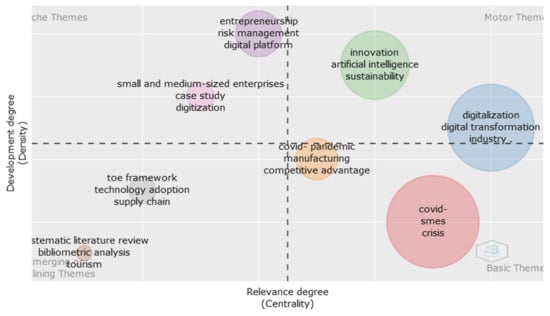 However, the need of SMEs for a business model that will help them to adjust quicker and safer in the digital community can be identified by a thematic map (Figure 11). Figure 11 presents the research themes which are obtained from the Bibliometric analysis. Each of the clusters in the graph indicate the themes of the research, while the size of the clusters highlights their proportionality to the number of the keywords. Each of the quadrants represents a different research theme []. The quadrant in the up-right position of the figure illustrates the motor themes, which are characterized by high centrality and density. Niche themes are represented by the quadrant in the up-left position of the thematic map and is characterized by low centrality and high density. Moreover, themes that are placed in the low-right position of the thematic map are known as basic themes, while low-left quadrants represent the emerging themes which are defined by low centrality and density. So, the business model of technology–organization–environment, which is known as TOE, is presented in the emerging themes of the thematic map [,,]. The appearance of this model indicates the need of small and medium enterprises for a business model that will help them to adopt and accept the emerging technologies, such as blockchain, artificial intelligence and machine learning, deep learning. The business model of TOE contributes to the presentation of both the limitations and the opportunities that can arise from the integration of the emerging technologies. Thus, TOE business model can help SMEs to embrace technological innovations without hesitation [].
