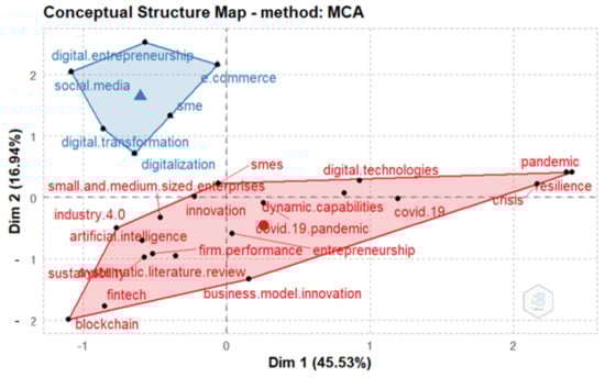 As it has been pointed out, the analysis of the keywords used by authors in the research field of digital transformation of SMEs during the pandemic of COVID-19 contributed to extract important findings regarding the studied research area. Authors’ keyword analysis highlighted the importance of digital transformation in SMEs, as well as the need for a business model that will help them to adjust in the new digital business community. However, future research directions in the studied area can assist SMEs to revamp their strategy regarding the digital transformation of the SMEs. Multiple Correspondence Analysis (MCA) is a method that clustered the documents that were retrieved from Scopus database and indicated the road for future research. Figure 12 illustrates the findings of the MCA method. There are two clusters: the one in the red color highlights the current situation in the field of digital transformation and the cluster in blue color indicates the future research directions. So, the cluster in blue color highlights the need for the inclusion of social media in the strategy of SMEs for adjusting in the digital community []. Social media platforms have created a new boom in economic growth. They offer networking to new markets and unlimited free exposure to anyone who knows their secrets and can tap into their potential. Social networking not only helps promote business, but also provides the privilege of learning from others []. In addition, the use of social media is a consequence of the greater use of emerging technologies, which lead to the flourish of e-commerce and digital entrepreneurship too.