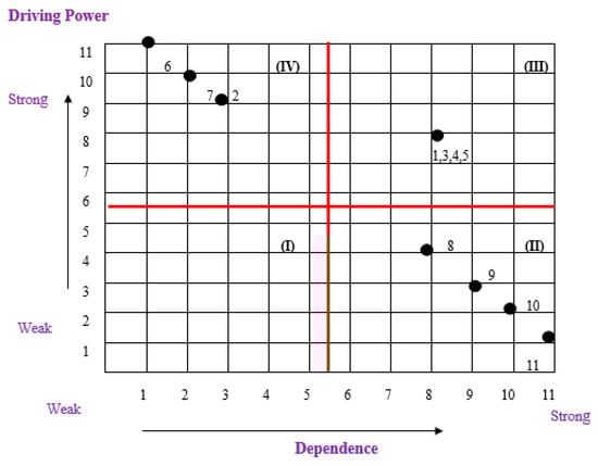 SCPMS enablers possess driving power and their dependence, using which each enabler can be plotted. Figure 3 shows the driving power and dependence of each SCPMS enabler. The clusters I to IV may be obtained as a result of MICMAC analysis. The enablers “awareness to SCPMS (6)”, “top management commitment (7)”, and “financial commitment towards SCPMS (8)” were found to possess high driving power and weak dependence thus falling into the group of independent SCPMS enablers. The enablers “employee commitment (8)”, “appropriate performance matrix (9)”, “benchmarking (10)”, and “sustainable SCM (11)” have strong dependence and weak driving power thus forming a dependence group. SCPMS enablers “loyalty to SC (1)”, “trust (3)”, “customer satisfaction (4)”, and “effective information system (5)” were found in the linkage group.
