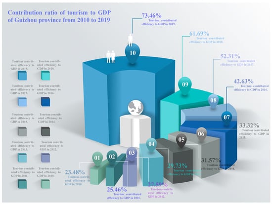 In recent years, Guizhou province’s entire tourist model and consumer experience have evolved toward personalization, diversity, and quality, which has fuelled Guizhou’s overall economic growth and promoted structural optimization. The ratio of Guizhou’s tourist industry’s GDP contribution from 2010 to 2019 (Figure 1) shows that the industry’s GDP contribution rose from 23.48% in 2010 to 73.46% in 2019. Due to the rising tourism production in Guizhou province after the associated upgrading and optimization of the tourist structure, these numbers demonstrate a solid predictability in the industry’s growth.