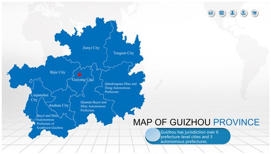 An introduction to Guizhou’s tourist resources is given below in light of the discussion above. Currently, Guizhou province contains three autonomous prefectures and six prefecture-level cities (Figure 2). The tourism market is progressively being standardised and improved, the overall comprehensive strength is considerably growing, and the tourist customer experience is steadily improving with the continued growth of Guizhou’s economy [18]. There are currently 48 regional minority groups residing in Guizhou, and these areas make up enormous village sites that will provide the impetus for tourism development in Guizhou province, paving the way for Guizhou’s tourism to move towards high standards. The integrity of the relevant infrastructural support directly determines the future expectations of tourism consumption, and the current state of Guizhou’s tourism resources echoes this thesis [19]. The following analyses the present state and features of the Guizhou province’s tourist resources from two angles.