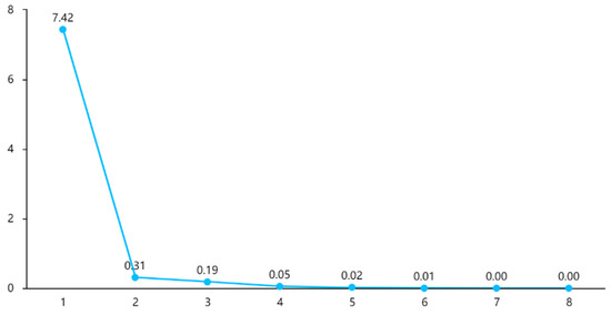 In this paper, eight independent variables affecting tourism economic development were selected, and factor analysis was required to facilitate the study and identify common patterns between the factors. Using factor analysis for information enrichment research, the research data were first analysed for suitability for factor analysis, as can be seen from the above table (Table 4): the KMO was 0.839, which is greater than 0.6, meeting the prerequisite requirements for factor analysis, implying that the data can be used for factor analysis research as well as meaning that the data passed Bartlett’s sphericity test (p < 0.05), indicating that the research data is suitable for factor analysis.