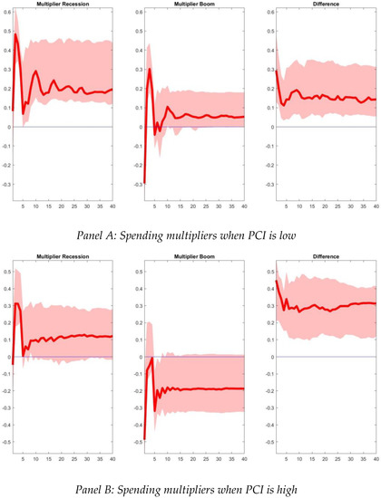 We provide new evidence that the cumulated effects of government spending shocks are strong and persistent during recessions when the level of partisan conflict is low. Our results show that, in the recession regime, government expenditure multipliers are large and statistically significant at all 40 horizons when PCI is low (as shown on the left of Panel A). In contrast, government spending multipliers are smaller in size and only significant in the short horizon in the regime of recessions when PCI is high (as shown on the left of Panel B). The finding aligns with the work of Azzimonti [15], who observed a negative relationship between partisan conflict and private investment in the US. High levels of partisan conflict can lead to high fiscal policy uncertainty, make expected returns on investment less predictable, and discourage private investment, thereby reducing the expansionary effects of government spending shocks on real income.