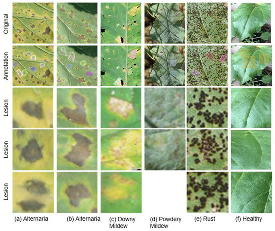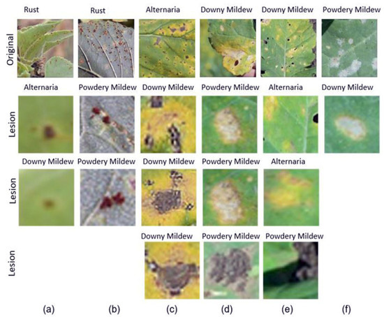 Lesions misclassified: (a) Rust original and lesions; (b) Rust original and lesions; (c) Alternaria original and lesions; (d) Downy Mildew original and lesions; (e) Downy Mildew original and lesions; (f) Powdery Mildew original and lesions.