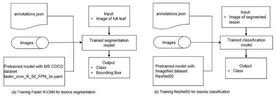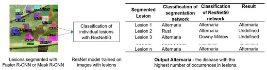 The system proposed to perform segmentation and classification is composed of a segmentation network represented by Faster R-CNN or Mask R-CNN, followed by a classification network. ResNet was selected to perform the classification step. Figure 2 presents the flow of segmentation and classification algorithms, and Figure 3 shows a graphical representation of this system. As the classification output of this system, we took the disease with the highest number of occurrences of lesions.