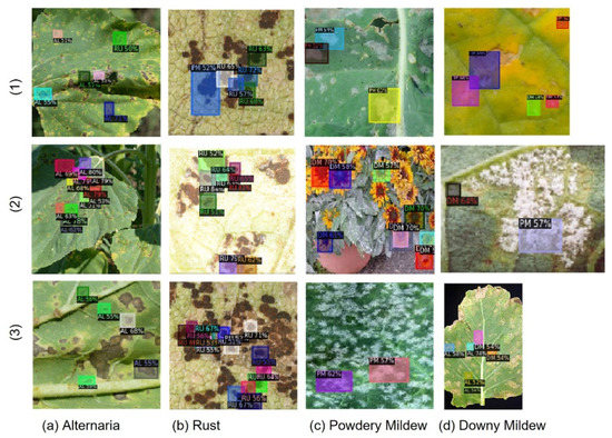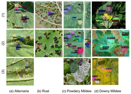 In images from Figure 4(a1,a3), all segmented lesions were correctly classified as Alternaria. In Figure 4(a2), most lesions were classified correctly, except for one, which was classified as rust. Rust images from Figure 4(b1,b2) were correctly classified, but in the case of rust, we can observe that a high number of lesions were not segmented. For downy mildew, the segmentation and classification were done correctly.